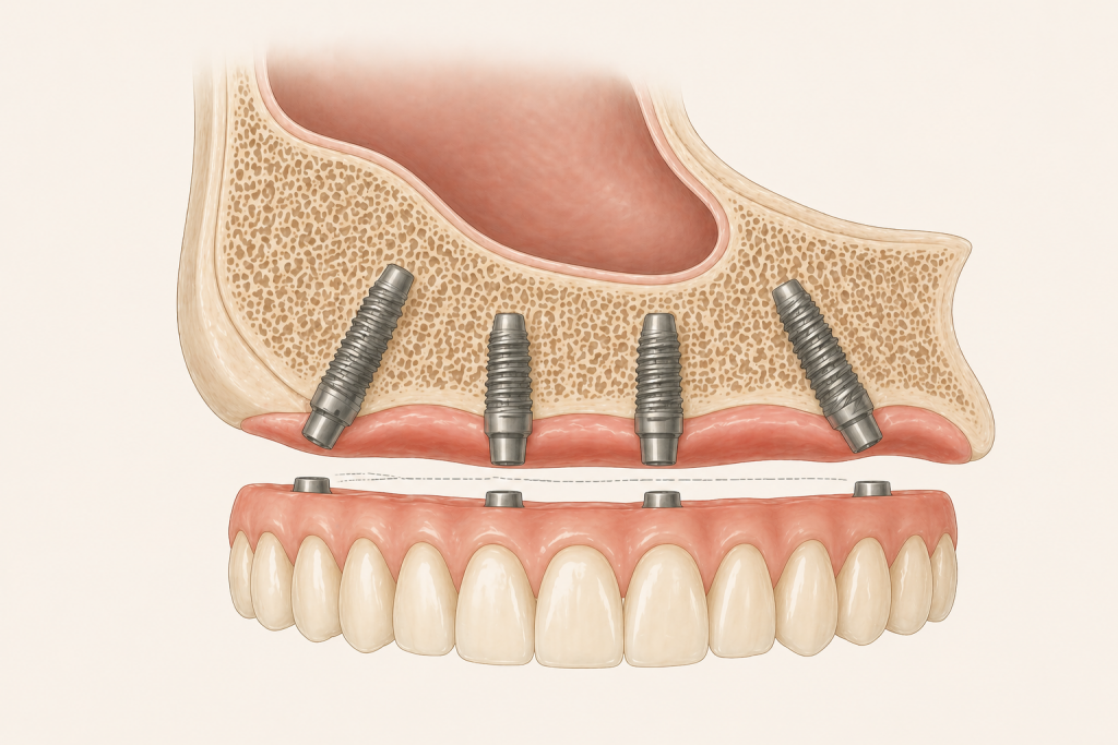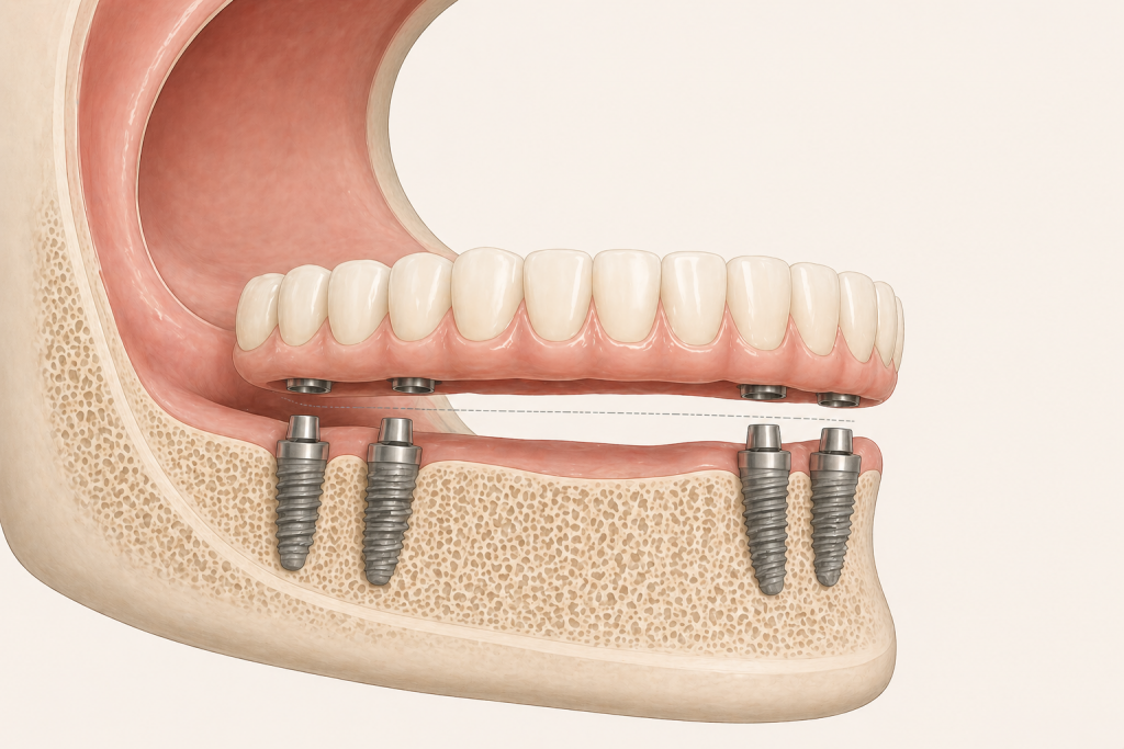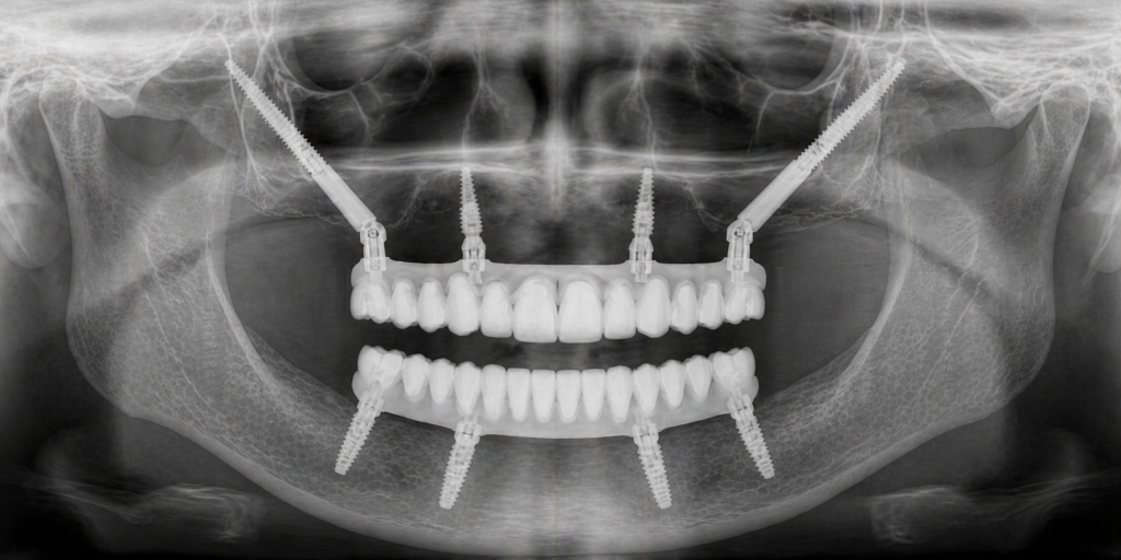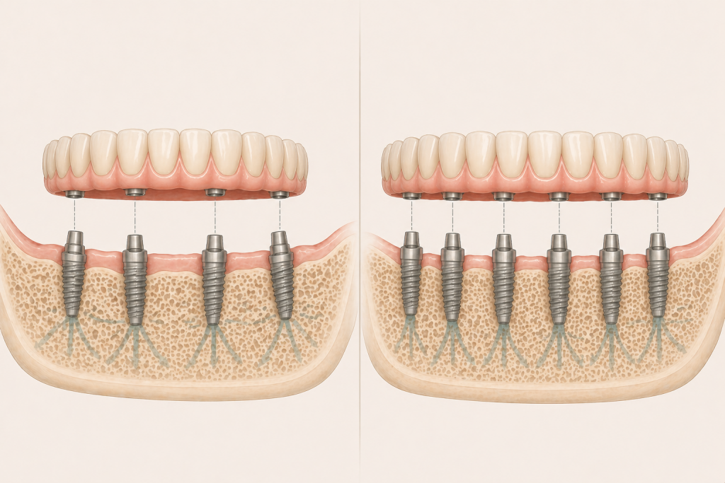 In alcune situazioni 4 impianti possono essere sufficienti per sostenere una protesi completa, in altre 6 impianti permettono una distribuzione più ampia dei carichi e una maggiore stabilità nel tempo.