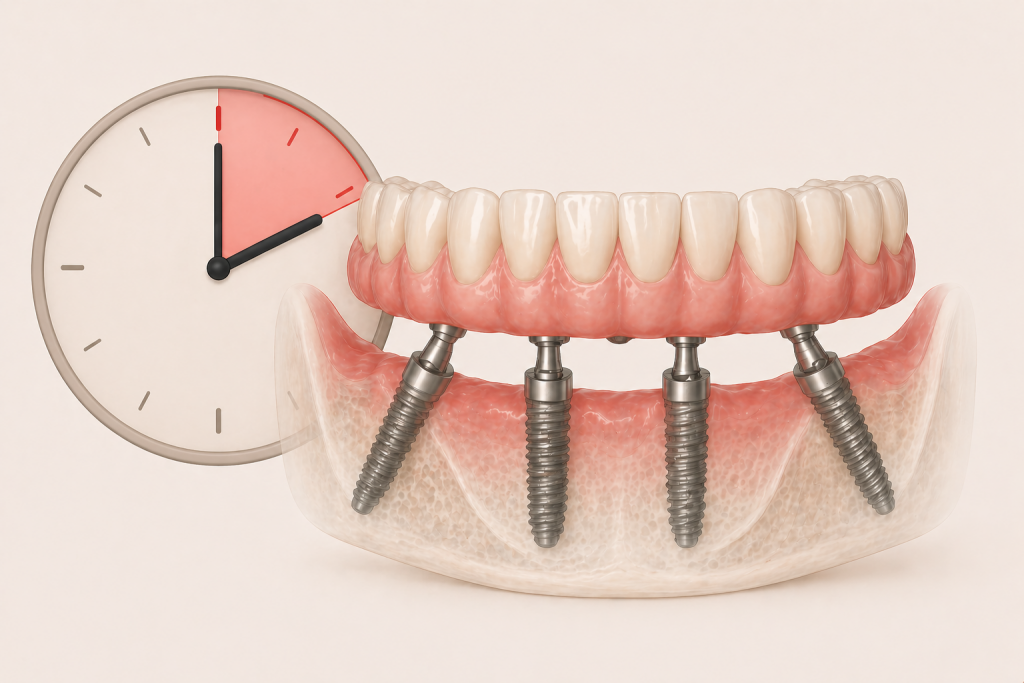 Nella pratica clinica, il carico immediato significa questo: gli impianti vengono inseriti e, entro poche ore o entro 24 ore, viene applicata una protesi provvisoria.
